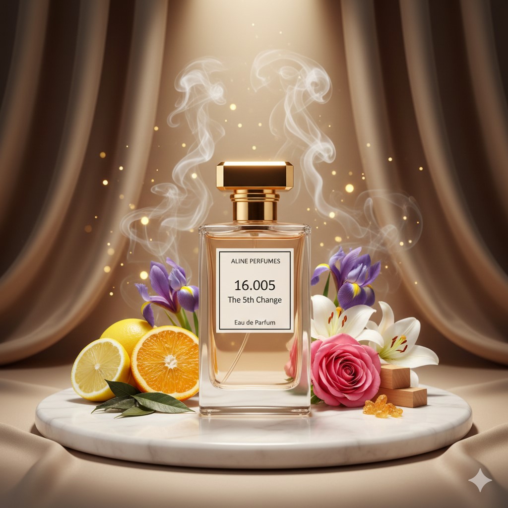 Το άρωμα ‘16.005 The 5th Change’ είναι εμπνευσμένο από τις οσφρητικές νότες της ‘Chanel No. 5’, προσφέροντας μια αρωματική εμπειρία που αποπνέει κομψότητα, κλασικότητα και θηλυκή γοητεία.